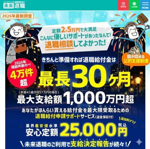 「未来退職」は、圧倒的なコストパフォーマンスと手厚い受給期間が魅力のサービスです。もっとも気になる料金は業界最安値水準の25,000円です。